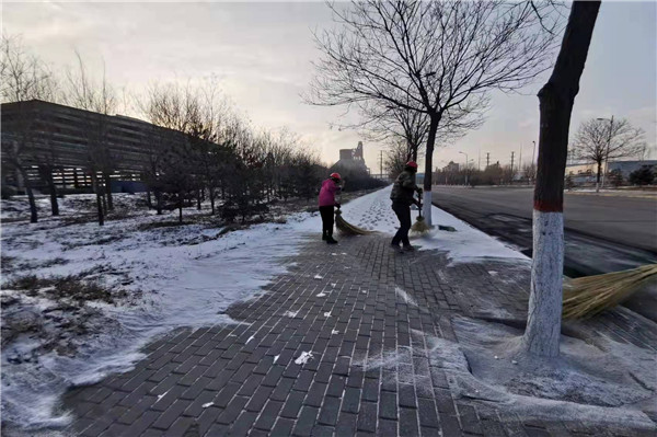裝置門前的松樹上掛滿雪球看著調(diào)皮且可愛,九點過后太陽開始照射,遠(yuǎn)遠(yuǎn)望去整個廠區(qū)銀光閃閃,讓人移不開眼。雖然雪景美麗但因為路面積雪會導(dǎo)致員工滑倒等危險,且廠區(qū)其他生產(chǎn)場地都需繼續(xù)生產(chǎn),不能因下雪而影響,所以在欣賞完雪景后的我們也開始了積雪大清掃活動。