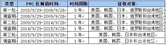 我國自2003 年開始對原產(chǎn)于美國、日本、韓國以及臺灣的PVC征收反傾銷稅。據(jù)商務(wù)部2018年第68號公告,商務(wù)部決定自2018年9月29日起,對原產(chǎn)于美國、韓國、日本和臺灣地區(qū)的進口聚氯乙烯所適用的反傾銷措施進行期終復(fù)審調(diào)查。調(diào)查自2018年9月29日起開始,于2019年9月28日前結(jié)束。如取消反傾銷稅,進口可能增加,并沖擊國內(nèi)市場。