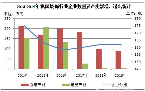 圖1 2014-2019年中國燒堿行業(yè)企業(yè)數(shù)量及產(chǎn)能新增、退出統(tǒng)計(jì)