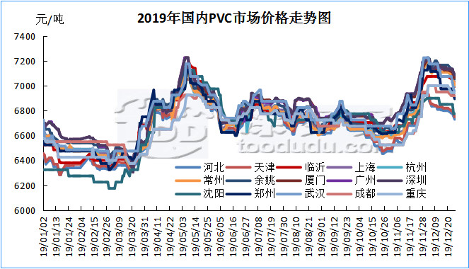 2019年中國國內(nèi)PVC市場仍舊是價格高位整理的一年,全年價格波動區(qū)間以華東主流為例在6440-7225元/噸之間,高低價差785元,從走勢圖以及月均價走勢可以看出,2019全年經(jīng)歷兩撥較大幅度的推漲,其中第一季度1-3月份市場較為低迷,處于低谷整理期,4月份開始市場價格開始緩慢上漲,經(jīng)歷不斷的上漲價格在5月中旬開始達到年內(nèi)第一次高點,價格達到高點后,需方承受能力有限,價格開始下行,下行至6月中下旬后,市場開始進入緩慢的整理期,長達4個月,6月中下旬-10月中旬,價格一直處于小幅震蕩整理中,供需雙方的博弈一度令PVC整體產(chǎn)業(yè)鏈進入迷茫期,多數(shù)行業(yè)內(nèi)人士甚至認為PVC產(chǎn)品的下跌大周期開始來臨,我們回顧下往年的PVC行情,其價格在15年5月初達到最低點后內(nèi)蒙出廠4350元/噸含稅,價格在歷史低點后開始不斷反彈,在經(jīng)歷了16-18年的整理后,在19年中國國內(nèi)PVC市場仍占據(jù)高點,四年間PVC生產(chǎn)企業(yè)賺的盆滿缽滿。但下游制品企業(yè)卻苦不堪言,并且自18年國家稅控改革以來,次終端貿(mào)易商對稅票逐漸失去控制,導(dǎo)致次終端利潤不斷下滑,規(guī)范的市場導(dǎo)致票貨分離減少。而在整個PVC產(chǎn)業(yè)鏈中,生產(chǎn)企業(yè)占據(jù)越來越多的話語權(quán),從而導(dǎo)致了雖然我們看到在迷茫期過后,第四季度國內(nèi)PVC市場仍舊迎來年底第二次大漲,此次上漲把PVC價格推上了真正的年底高點。第四季度的上漲導(dǎo)火線為內(nèi)蒙企業(yè)裝置出現(xiàn)意外事件停產(chǎn),市場炒作聲漸起,價格開始上漲,而隨后的11-12月份,在期貨的帶動下,價格不斷被推上新高。12月中旬需方面對如此高的價格開始產(chǎn)生抵觸心理。而此時的年度備貨來臨,市場不但沒有復(fù)漲反而開始進入蕭條期,價格開始下滑。