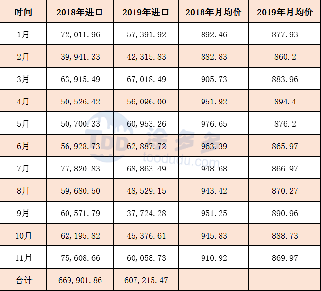 2019年1-11月累計進口數(shù)量為607215.47噸,同比去年減少62686.39噸。跌幅9.36%,國內(nèi)產(chǎn)能供給充裕,進口量大幅下跌。