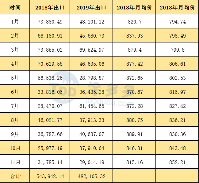 2019年1-11月累計出口數(shù)量為482105.32噸,同比去年減少61836.82噸。跌幅11.37%,進出口抵消來看,國內(nèi)市場供需變化不大。出口數(shù)量的減少彌補了進口的減少。