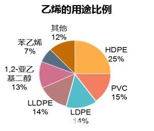 聚乙烯(簡稱“PE”)以及聚氯乙烯(簡稱“PVC”),都與乙烯有相當密切的聯(lián)系。乙烯源于液化天然氣、液化石油氣、輕柴油、重油或原油等經裂解產生的裂解氣中分出,亦可以從焦爐煤氣中產生,還可以從乙醇脫水中獲得。在全球聚乙烯制作方法中,其中44%為原油產出石腦油制乙烯,43%為天然氣產出乙烷氣制乙烯,13%為煤炭/天然氣產出甲醇制乙烯。在乙烯的所有用途中,PE和PVC對乙烯的使用量最大,分別占比53%和15%。