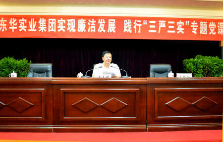 6月8日下午,東華實(shí)業(yè)集團(tuán)按照市紀(jì)委、組織部、宣傳部等部門聯(lián)合下發(fā)的《關(guān)于開展“實(shí)現(xiàn)廉潔發(fā)展”書記講黨課競賽活動的通知》要求,集團(tuán)公司董事長、黨委書記、總經(jīng)理金克緒以《踐行“三嚴(yán)三實(shí)”,做忠誠干凈擔(dān)當(dāng)?shù)暮酶刹俊窞轭}給集團(tuán)公司各級領(lǐng)導(dǎo)干部上了一堂生動的黨課。
