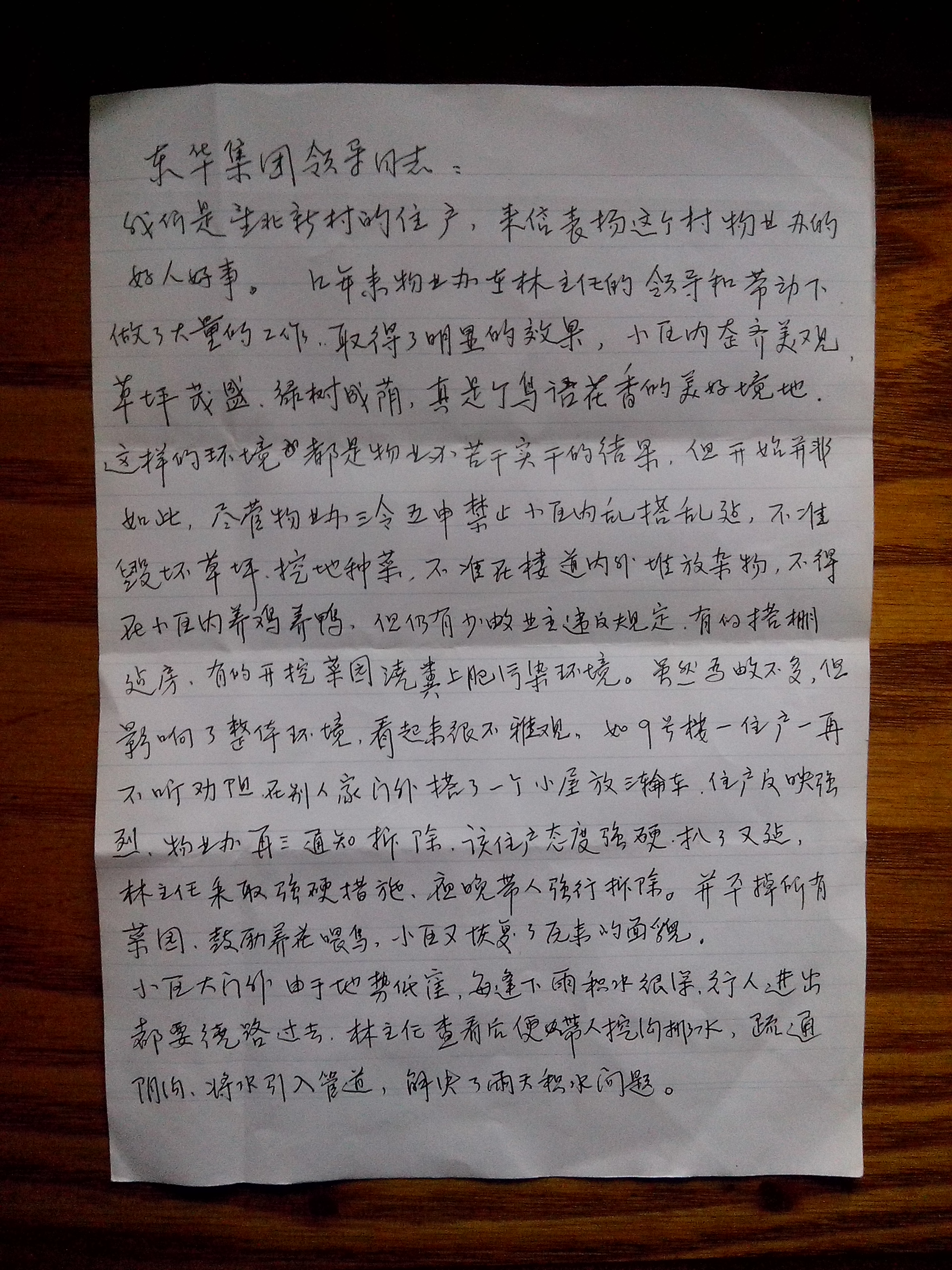 總之,這幾年來物業(yè)辦確實(shí)為小區(qū)出了力流了汗,做了大量工作,受到業(yè)主們的普遍稱贊。因此,特寫此信,請給予他們公開表揚(yáng),以資鼓勵(lì)。
