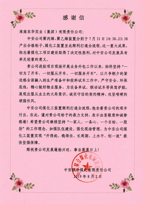 中安聯(lián)合煤化有限責(zé)任公司表示,其項(xiàng)目的順利開展,飽含著東華實(shí)業(yè)集團(tuán)的艱辛付出。并對(duì)東華實(shí)業(yè)集團(tuán)給予的鼎力支持,表示由衷敬意和誠摯感謝。最后,祝愿東華實(shí)業(yè)集團(tuán)發(fā)展蓬勃興旺、事業(yè)蒸蒸日上!