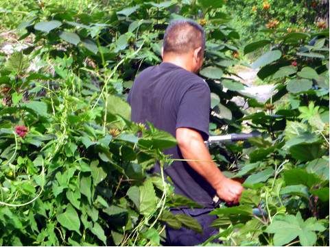 巡查線路、配合抄表是李元華的日常工作,不知情的人,肯定會把這兩項工作想的較為簡單,筆者也是如此,但陪同李元華到南舍和崇文村的查線路后,才知道這項工作有多么艱苦。巡查道路上,沿途只見荒山野道,有的地方有路,有的地方根本就沒有路,雖然有自行車,但也只能騎一段推一段,有時還要在一人多高的野草和葦子里穿行,筆者在里面沒走幾步,就被野草纏住進退兩難,李元華笑著說:“現(xiàn)在天越來越熱了,野草叢里的拉拉藤馬上就要長密,到那時候我們也經(jīng)常被纏住。”他給筆者看他的手臂,上面滿是歷年來被拉拉藤纏住后傷留下的傷疤。最難走的地方,他不肯帶筆者去:“你沒走慣山路,根本上不去,而且那些地方草深蛇多蝎子多,你穿的是皮鞋,腳背全露在外面可不安全。”他說走在那些地方,他們穿著勞保鞋都得注意,經(jīng)常邊走邊拿東西在前面打著草,好驚走蛇蝎。