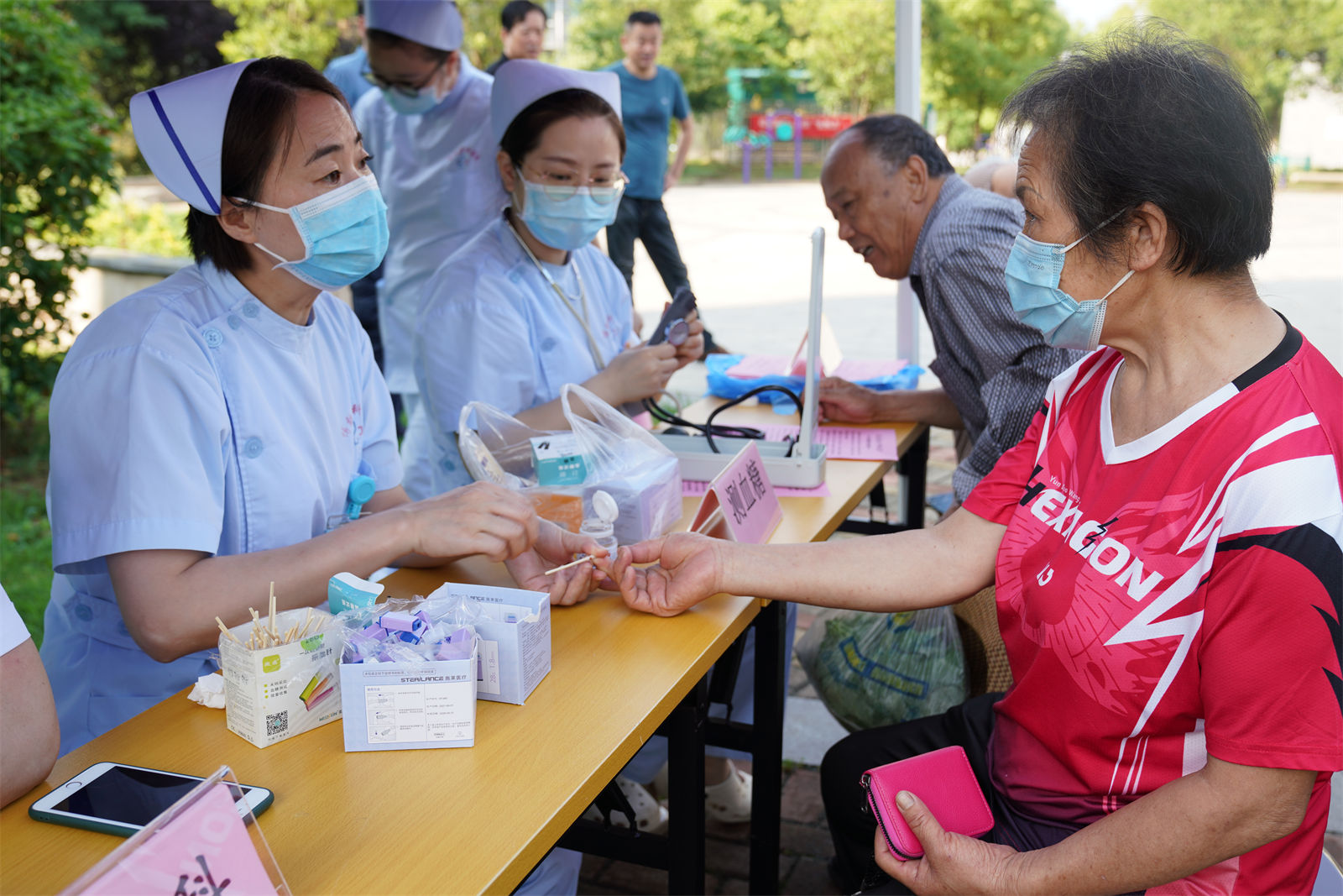 活動現(xiàn)場,轄區(qū)居民在物業(yè)工作人員的引導(dǎo)下有序排隊,等待檢查咨詢。來自博致骨科醫(yī)院的醫(yī)務(wù)人員盡職盡責(zé),認(rèn)真地為前來咨詢的居民測量血壓、血糖,耐心細(xì)致地為居民答疑解憂,針對居民們的個人情況給出了健康方面的建議。