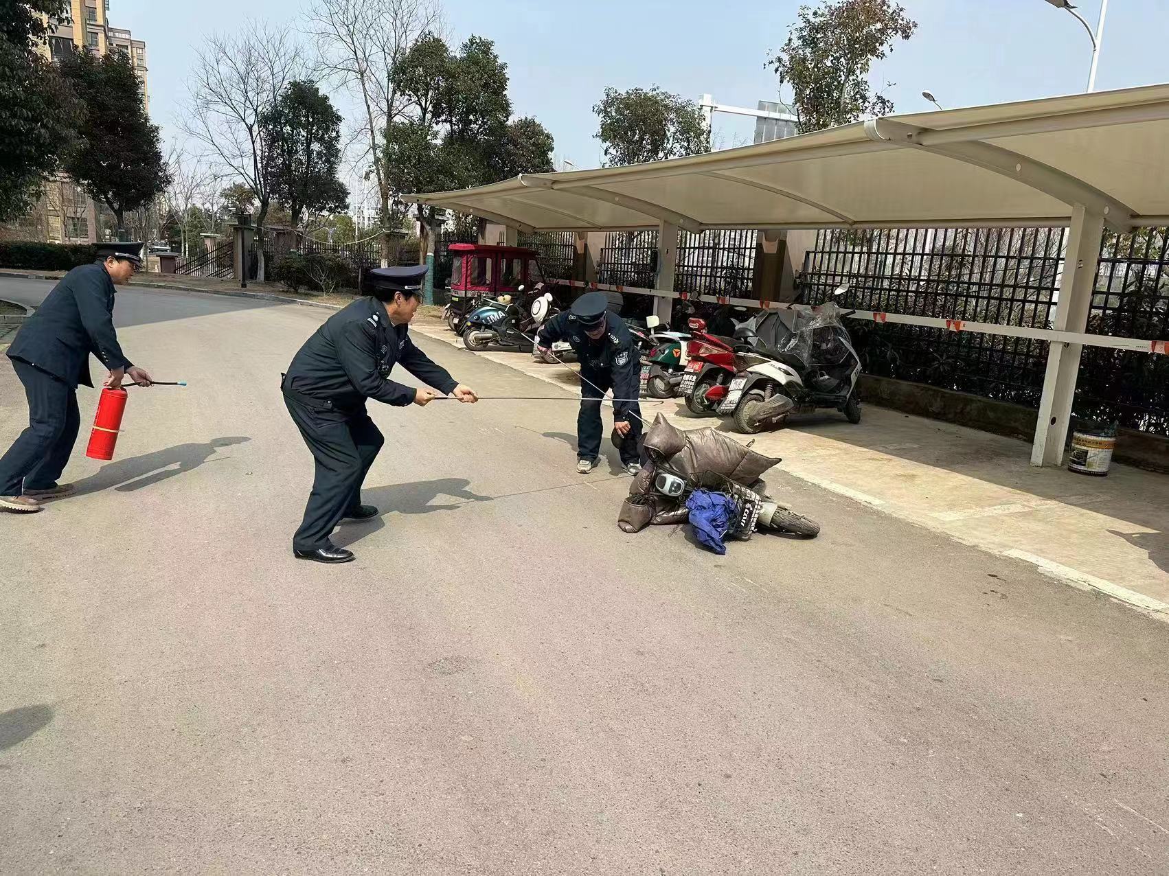 演練開始,監(jiān)控室人員通過監(jiān)控發(fā)現玫瑰苑16號樓東側電動自行車充電車棚發(fā)生“火災”,隨即通過對講機呼叫現場巡邏人員及工程人員前往現場。接到通知后,巡邏人員及工程人員在短時間內立即趕到現場,根據應急預案流程展開撲救。