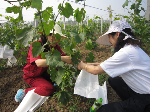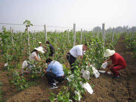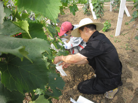 八公山物業(yè)分公司領導干部積極響應東華集團轉(zhuǎn)變機關工作作風“走基層、創(chuàng)先爭優(yōu)”的號召,于6月14日上午來到東華怡樂園生態(tài)農(nóng)莊,將一串串即將成熟的葡萄穿上了“防護衣”。