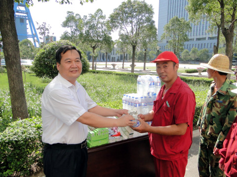 對于常年高溫的洗衣機房,針對蒸汽管溫度過高問題,該隊男職工找來隔熱材料,將其包裹,有效降低了室內(nèi)溫度;對于新接手的車房,針對值班室在車房外且無任何降溫設施的情況,項目部領導向礦方爭取了空調(diào),第一時間安裝到位;對于奮戰(zhàn)在工廣路的清潔工,領導們?yōu)樗麄兯腿チ朔朗罱禍氐乃幤泛褪称,并一再叮囑大家要輪流作業(yè),適當休息,如有不適要立即停下工作或報告班隊長。同時,做好內(nèi)部穩(wěn)定工作,營造團結(jié)和諧的工作氛圍,保障職工平安度夏。