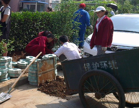 洞泉物業(yè)處洞山新村(上東錦城)小區(qū)成立至今已有多年,小區(qū)綠地多處被損壞,尤其是幼兒園和休閑廣場(chǎng)附近,因?yàn)樵S多家長(zhǎng)經(jīng)常在園外觀看孩子做操和一些室外活動(dòng),損壞尤為嚴(yán)重。這樣既影響小區(qū)的整體美觀,又不利于園外的花草生長(zhǎng)。針對(duì)這種情況,在與業(yè)主委員會(huì)協(xié)商后,該處購(gòu)買來(lái)草坪磚、沙子等材料進(jìn)行修整鋪設(shè)。六月的天氣時(shí)陰時(shí)晴,陰時(shí),悶熱異常,讓人喘不上起來(lái);晴時(shí),陽(yáng)光四射,讓人睜不開(kāi)眼睛。就是在這種環(huán)境下,小區(qū)辦的工作人員齊心協(xié)力開(kāi)始了翻土、找平、鋪磚、砸平……大家干的很賣力,每個(gè)人都汗流浹背,但是沒(méi)有一個(gè)人喊苦叫累。大家心往一處想、勁往一處使,都想著快一點(diǎn)干完,早日完成好方便業(yè)主。在把幼兒園附近的草坪磚鋪設(shè)好以后,大家又一鼓作氣,將健身廣場(chǎng)被損綠地也一并鋪上草坪磚。物業(yè)人員的辛勤付出得到了業(yè)主高度贊揚(yáng)。