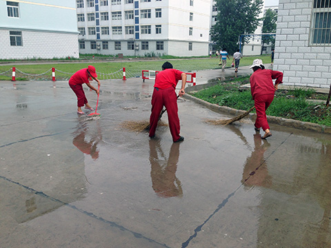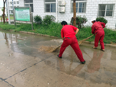 7月17日下午2點(diǎn)半左右,天降瓢潑大雨。由于雨勢(shì)猛,降水時(shí)間集中,礦內(nèi)很多地方出現(xiàn)了大面積積水現(xiàn)象,短時(shí)間整個(gè)礦區(qū)工廣路面一片汪洋,個(gè)別路面較低和排水較慢的區(qū)域甚至沒過小腿,影響到工人們的正常行走和車輛的行駛。見狀,東華潘一東項(xiàng)目部工廣環(huán)衛(wèi)保潔人員,紛紛冒雨拿起大掃帚、水桶、鐵鍬等工具,將積水一掃帚一掃帚的趕到排水口和窨井處,對(duì)排水不暢的地方及時(shí)疏通。降水持續(xù)了近兩個(gè)小時(shí),他們?nèi)徊活櫼路訚裢噶,身體著涼了,始終不停的奮戰(zhàn)在現(xiàn)場(chǎng)。雨,漸漸地停了,他們?nèi)匀粓?jiān)持處理完剩下的積水,看著干凈的路面,再互相看看對(duì)方“落湯雞”的樣子,都開心、會(huì)意的笑了。他們此次突擊任務(wù)也得到了礦方和項(xiàng)目部領(lǐng)導(dǎo)的一致好評(píng)。