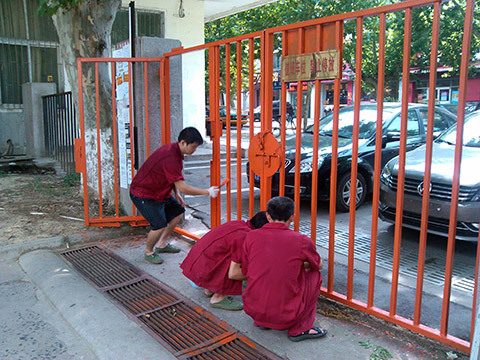 洞泉物業(yè)處洞山新村(上東錦城)小區(qū)南門由于常年風吹日曬,顏色脫落嚴重。為了不影響小區(qū)的整體美觀給小區(qū)業(yè)主一個良好的居住環(huán)境,小區(qū)辦的師傅們從處里領(lǐng)來油漆、刷子等工具。八月的天氣炎熱無比,太陽把它的光和熱無情的灑向人間,大地被燒的滾燙,一滴一滴的汗水從他們的額頭上滴下,浸透了他們的衣服,可是師傅們顧不得這些,認真的刷著油漆,只怕稍不留神影響了整體美觀……一個多小時過去了,過往的小區(qū)業(yè)主看到鐵門舊貌換新顏,都直夸師傅們活干的漂亮呢!