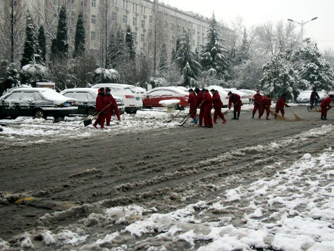 清晨6時,該處所有人員兵分兩路,一是以化學(xué)作業(yè)為主的灑鹽除雪隊,分別對礦內(nèi)及家屬區(qū)主要交通路段進行灑鹽除雪;三是以人工為主的人工除雪隊,以鐵撬掃把為作業(yè)工具,從辦公大樓分別向礦內(nèi)、礦外進行除雪。