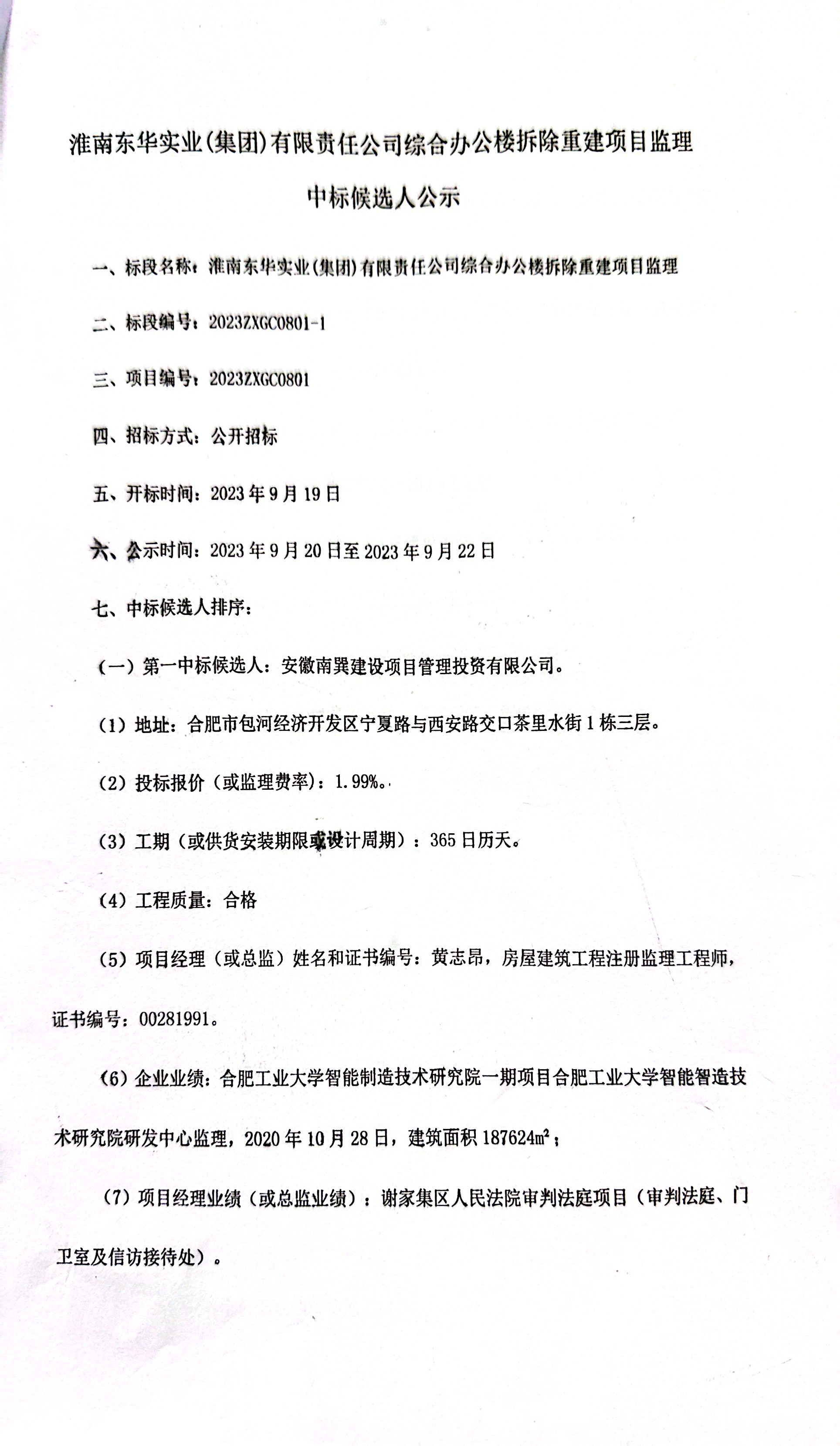 淮南東華實業(yè)(集團(tuán))有限責(zé)任公司綜合辦公樓拆除重建項目監(jiān)理中標(biāo)候選人公示