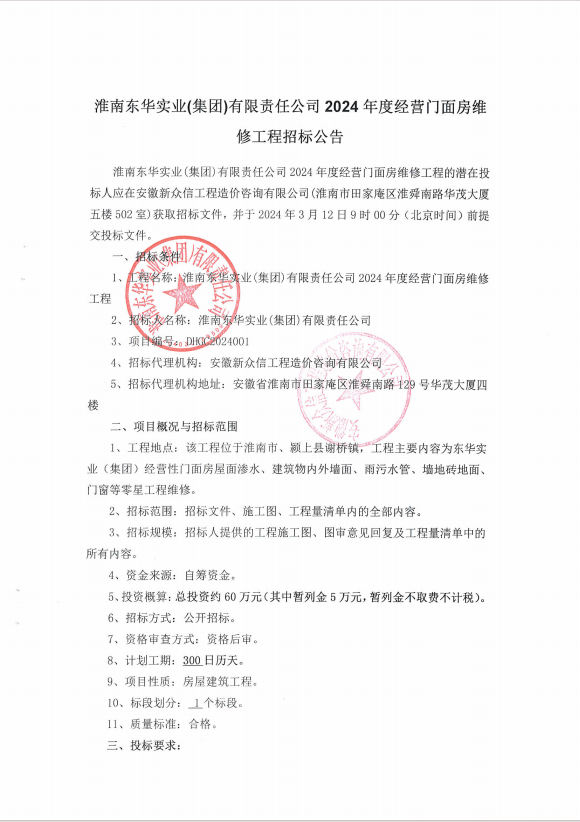 淮南東華實業(yè)(集團)有限責任公司2024年度經營門面房維修工程招標公告