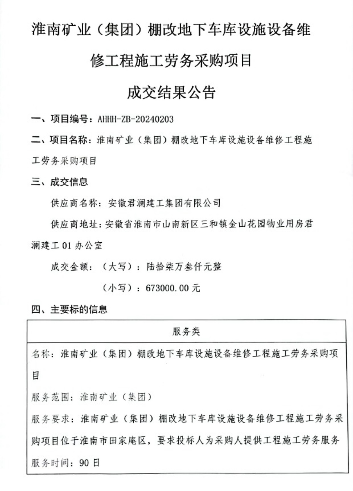 淮南礦業(yè)(集團)棚改地下車庫設施設備維修工程施工勞務采購項目成交結果公告