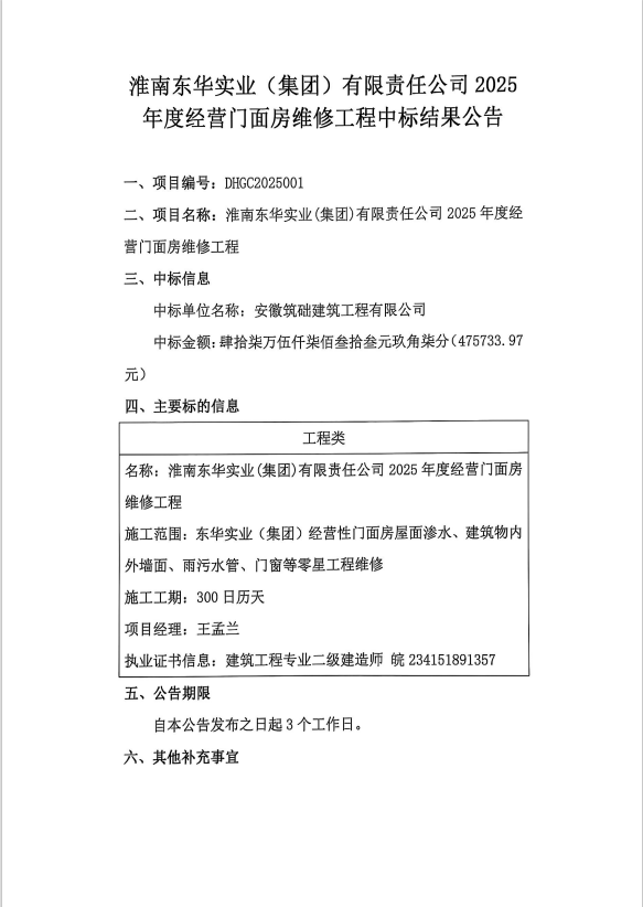 淮南東華實(shí)業(yè)(集團(tuán))有限責(zé)任公司2025年度經(jīng)營(yíng)門面房維修工程中標(biāo)結(jié)果公告